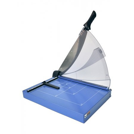 Výkonné pákové řezačky s kovovým stolem a plastovým ochranným krytem. Na stole je lišta s měřítkem, zadním dorazem a jsou na něm vyznačeny běžné DIN formáty. Délka řezu je 460 mm…více