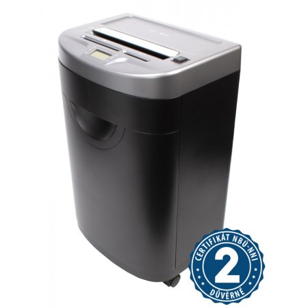 Kvalitní skartovací stroj atraktivního designu, s vysokým stupněm utajení skartovaného materiálu. Vhodný pro kanceláře a úřady. Skartovač je vybaven bezpečnostní funkcí Safe Touch, která zastaví stroj při dotyku vstupní štěrbiny rukou. LCD display ke kontrole zapnutých funkcí. Stroj je standardně vybaven automatickým systémem start/stop, zpětným chodem, tepelnou pojistkou motoru proti přehřátí, signalizací přeplněného koše. Příležitostně lze skartovat sešívací sponky. Samostatný vstup na kreditní karty nebo CD. Tichý chod stroje-55 dB. Lehce vyprázdnitelná odpadní nádoba o objemu 35 l. Skartuje naráz až 15 listů A4, 70g. Stupeň utajení NNI2 důvěrné. Součástí stroje jsou pojezdová kolečka.