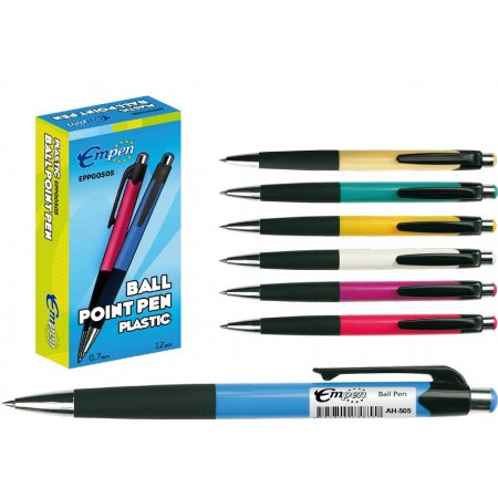 Plastové kuličkové pero s gumovým úchopem a šířkou stopy 0,7 mm. Barva náplně modrá.