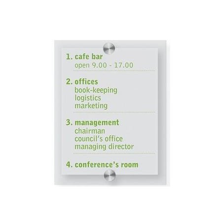 Informační dveřní tabulka určená pro vnitřní použití jako ideální řešení orientačního systému a označení. Skládá se ze dvou desek vyrobených z průhledného plexiskla. Na krátkých stranách desky jsou umístěny dekorativní šrouby z nerezové oceli pro