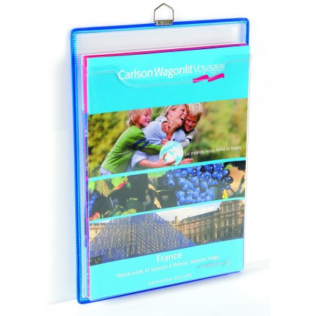 Velkokapacitní PVC kapsa na prospekty a brožury s očkem je ideální do obchodů, recepcí, hal či chodeb pro prezentaci propagačních materiálů. Díky odolnému kovovému očku lze kapsu zavěsit s orientací na výšku kamkoli, a stává se tak jednoduchým a praktickým řešením pro prezentaci důležitých informací. Zadní stěna je doplňkovou kapsou k umístění např. letáku nebo pokynů k použití vložené informace. Tvarově pevná kapsa má hloubku 2 cm s kapacitou až 180 listů formátu A4. Záruka: 10 let. Barva lemu: modrá. Balení: 5 kusů.